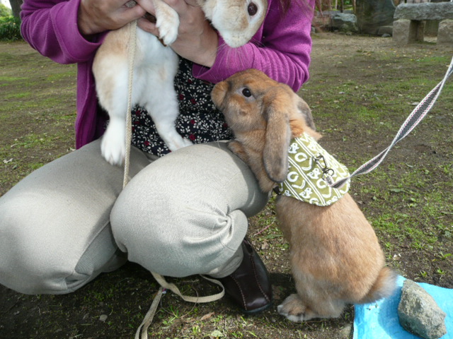 今日はうさんぽにチャレンジです」 先日作ったハーネスをつけて 福ちゃん出陣!! ももちんも同行させたかったのですが一緒に行ったのが ♂うさのりんちゃんだったので福ちゃんが参加 興味津々の福ちゃん ご挨拶早々にカクられておりました(笑) 大人の世界を体験した福ちゃん 最初は見慣れぬ風景にじっとしていたものの 慣れてくるとあっちぴょこぴょここっちぴょこぴょこ 楽しそうに走る走る 今回行った所は木が多く木陰もあり メインの公園から少し離れてる事もあって わんこに会うことも少なくゆっくりうさんぽが出来ました ここでもわんこっぷりを見せてくれました 旦那がリード持ってちょっと歩けば 「とおちゃ~ん」と 一生懸命ついて歩いてました その様子は子犬の散歩・・・ 最初緊張してる時は父ちゃんの足元に ぴったりひっついてた福ちゃん く、悔しい 2時間で散歩は終了、その後はケージ内でりんごや水菜も食べて 水分もしっかり補給、楽しいお散歩でした 次はももちゃんで挑戦だ PR