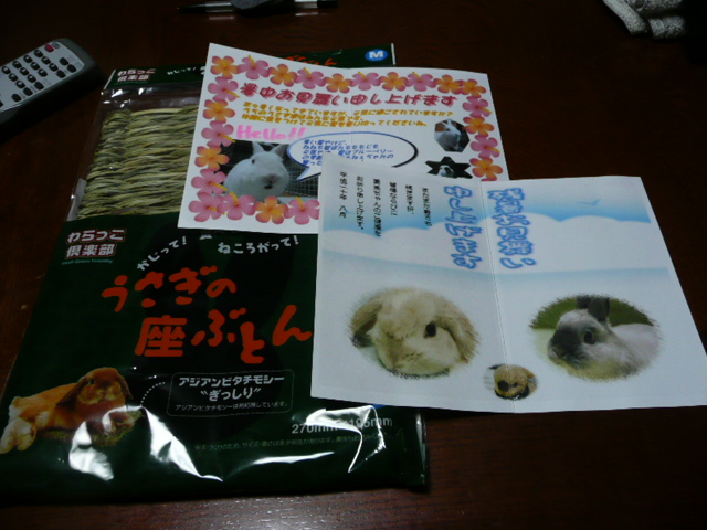 でも仕事に行く時はまだ不安なので エアコン稼動です 先日ちょこっと書いた手の事ですが こんなんなってました ![]() 一番酷い時で 指の先までずーっと電流が走ってるような感覚が 取れませんでした 自宅のサプリ等飲んだりしてたのですが改善どころか悪化の一方 「これはヤバイ」と整形外科に行ってきました レントゲンも撮ってもらってしっかり検査 首、肩、肘に異常はなく手首を酷使した結果炎症を起こして 痺れになったのだろうとの結果になりました 「あまり無理しないように固定しましょう」 と言われたのでサポーターとシップかなぁと思っていたら ・・・ギプスを作られました ![]() 見た目すごい重傷者になってしまったくまおですが 処方してもらったビタミンB12とギプスのお陰で症状は回復傾向 固定して初めて気づくもんですねぇ 手首確かに何かにつけて使います ずーっと取れなかった痺れはかなり引きました ちょっと無理して手を使った時には痺れが出ます 溜まりに溜まって出た症状なので すぐには全快しない 調子を見つつゆっくり治していきなさいと言われました ギプスは着脱可能、家事、仕事、用事に応じて固定したりはずしたり ちょっと長くて不自由だったので短く切ってもらいました 薬も真面目に飲んでます 新しいオーダー物も考えて試作品製作 モデルさんはももちん 「マフもあるのよ うふふー」すがわらさんと しもサンからすてきなお葉書を いおりんママさん からはブログ1周年の プレゼント参加賞を (敷物は既に1個福ちゃんご機嫌使用中) ありがたやありがたや ん?んんん??? さすが母上 また元気が出るもの送っちゃうよ めっちゃ緊張しぃ(※名古屋・大阪出店参考)で 実は人と話すのが苦手なくまお うさぎと生活するようになってから出来たご縁で 世界がすごく広がりました ほんと嬉しいです この机周辺手の届く範囲に材料等がほぼ配置 「亜空間のパティシエ」さまぐらい 広いスペースが欲しい 院長のところに一度研修に行きたいなぁ~ 関東、もう15年以上行っておりません っていうか方向音痴なんで行けません・・・