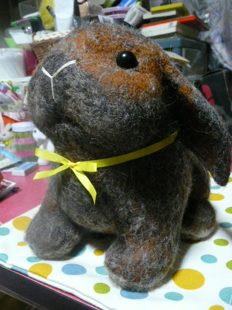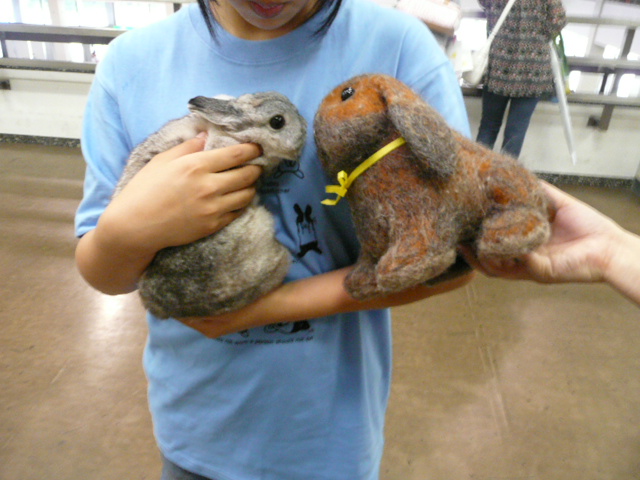 一か八かで書いてやる~ 昨日に引き続き怒涛の名古屋うさぎ祭ネタでお送りいたします 今回くまお一家が名古屋に出店しようと思ったのは 全国各地に旅立っていったくまおの作品達のオーナーさんに 会えるかもしれないと思ったのと 福助の時にたくさん励ましのコメント頂いたので もしかしたらその人達にお会いできるかもしれないと思ったからです 正直福助が遊びに行った後は「名古屋なんか無理、絶対無理」と 止めようと思ってましたし旦那に泣きを入れました、 でもたくさんの人が福助の事を思いたくさん励ましてくれました。 落ち着いてきたらその人たちにお礼が言いたい、福助の事話したいと 思うようになり、25日まで一家一丸となって突き進んできました 搬入直前まで吐きそうになって逃亡しようとしたくまおですが 行ってよかったです!! 「はじめましてもい」 そうです、もうさぎ日記のヨーコさんの 愛兎もいさんです ![]() 憧れのもいさんを抱っこできてにんまりの2号 「もいさん、ちっちゃくて可愛い 」有名な「もいもいがっぱ」をまたも撮り損ねて凹むくまお もいさん!!いつの日かリベンジをさせて下さい!! 福助と一緒に生まれた兄弟の美濃吉君の飼い主様の 美濃母さん ご夫妻も京都から来られて声をかけてくださいました 福助はトート、美濃君はチェスでぱっと見は違うけど 何かの折の雰囲気がやっぱり兄弟、すっごく似てるんです 美濃ちゃんの写真頂いて一層思いました 美濃ちゃんいっぱい食べて元気でいてよ!! ももと姉妹の琴ちんにメロメロな しもサンご夫妻も京都から参戦です 琴ちんカラーを必死に探す姿にもうどれだけメロメロか分かります ももと琴ちん、めっちゃ似てるんです 朝、出発直前に撮ったももの写真をご夫妻に見せるくまお旦那 あ、それは私がして自慢しようと思ってたのに、ちっ もちっと大きくなったらふりふりの可愛いハーネスを着せて 会わせたいなぁ、ハーネス作ってみるか?? 同じく兄弟姉妹つながりで うーちゃんち のazzさんも来て下さいました!! おまふが素敵なうーちゃん もも、あんなセクシーまふ早くできんかなぁそしていつも読んでたけど恥ずかしくて書き込めなかった ♪チョコとモカの湘南物語♪のゆうさんとお会いする事に!! 新しくお迎えされたロッティー君がこれまたももと同じカラー?? か、可愛い・・・お姉ちゃんに囲まれてどんな子になるのかな?楽しみだ しっかりお名前を聞いてお話できなかった方でも 「ブログ見てますよ~」とたくさん声かけていただきました 人の中にはいって色々するのが苦手なくまおがこんなにたくさんの人と 知り合えるなんて、ほんま福助ともものおかげです。 ちっちゃい体に不思議な力がいっぱい詰まってるねんなぁ そしてずっと憧れてた方についに自分から声をかけるという 快挙を達成したくまお!!その方は うさぎの権造の生活デラックス2 のおかんさん!! 権造君と安寿ちゃんの仲良しの姿を見て憧れて 福助に妹を・・と思ったんです 是非お声を、と探したのですがうさ耳をつけておられたんで 苦労せず見つける事ができました(笑) この子、頭のどこかに安寿ちゃんの イメージがあったんでしょうね 「おかんたんのいえにいくのでちゅ」 おかんさんに連れて帰ってもらうまで じっと我慢の良い子でした おかんさんのところで安寿ちゃんと一緒のところ見たら めっちゃ嬉しく、そして恥ずかしい・・・ ちょっと落ち着いてきたので くまおもお土産を買いたい2号を連れて ふらふらと会場探検、ぐるっと一周しただけで 2号に次から次へと買わされました あの・・帰りの高速代は確保したいんですが コンテストの様子も見たいなと思いつつ 店も気になり結局1階の会場に降りる事のなかったくまお 上からとらちら見ましたが盛況でしたね まさしく店の周りを熊のようにうろうろしてたくまお うろうろというよりおろおろやな ぶっつけ本番に強い社長1号営業トーク全開で 現在お休み中のオーダーの話まで勝手に進めてました あのぉ、作るの私なんですけど だらだら書いたわりに 「何もレポートないやんか??」なうさぎ祭りネタです だってお店見てるので精一杯やってんもん 次回最終回、嬉しい嬉しいご褒美が明日明かされる!!