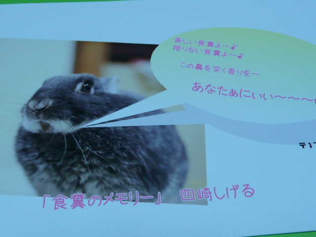 突然の事でまだ夢じゃないかと思ってます たくさんの方にご心配おかけしたので ご報告させていただきます ごめんなさい ごめんなさい お返事できません くまお堂もちょっとお休みさせてください ごめんなさい ごめんなさい 何張り切ってるの?」 福ちゃん、今日はうさんぽ会ですよ!! 「あ、そか」 あんたも広いところで走り回れるよ 現在朝9:00前ですがお日様ばっちり うさちゃんには暑すぎるかもしれないので みなさん保冷材等暑さ対策してあげてくださいね 青空市出させていただきます でも私はよそのうさちゃんと 戯れたい~ 一枚のお知らせが・・・ 「あー舛添要一からかぁ」 って、違うよ違う これはあの「食糞グループ」からだ!! 実はくまお先日年金番号が2つあるということが判明 結婚で退職して切り替えたときに起こったみたいですね ちゃんとしろよ社保庁、その時職員の人から 「確認かねて年金特別便送りますんで」って言ってたんで すっかりだまされました。 しかし料金別納って凄すぎるどんだけ社員抱えてるんだ「食糞グループ」 食糞グループの一員として さらに怪しい創作活動に励まねば よつぱぱさんありがとうございます 家宝にします(既に2号が狙ってる) 腹の底から(爆) 盲腸糞、しっかり食べるんで 落ちてたりすることはほとんどないんですが たまにあると確かに・・・匂いますな うさんぽ会に備えて準備中、晴れたらいいなぁ |