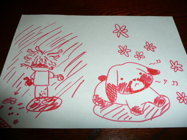 昔は高校受験は中3の夏からで大丈夫とかやったけど 今はもう1年生から成績がずーっと反映されるのね 今回ちょっと頑張れば評定が上がるラインの2号 頑張ってほしいものです ・・・・何か机に向かって必死に書いてます 何でしょうね?? 何してんだよ 2号画「お母ちゃん」 イベント等で生くまおご存知の方は 噴出すでしょう まん丸なボディにぼっさんぼっさんの頭 えぇ、そっくりですよ、怒りようが無いですよ ちょっと細身に描いてくれたのは 2号の優しさ また何か書いてるよ・・・ さんぽでご機嫌な福助と 飛び散るシッコと●で すごい形相のくまお ええ、ズボンにもシッコが跳んでますね(笑) いつもの風景です 福助のまったく悪いと思っていない顔がまたそっくりで爆笑 本人曰く、色付けが下手っぴらしい よつままさんや ばくのオカンさん みたいに素敵に描きたいらしいし ころんさん のテイストも魅惑的らしい 頑張れ!!2号!! でもな、この頭がメドゥーサ化した母ちゃんの怒りの矛先が 向かないうちに机に向かいましょうね