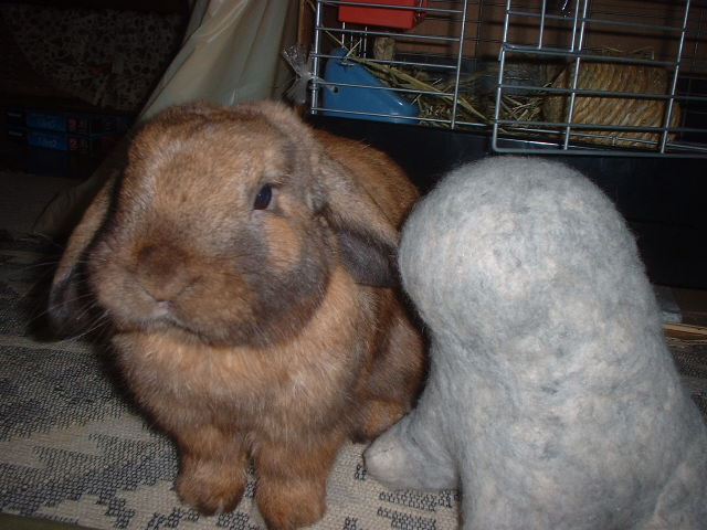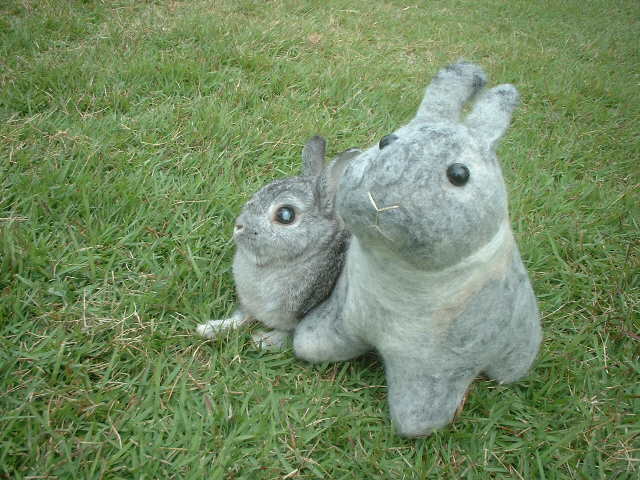 前日2号学校の役員の仕事でへろへろさっさと寝たくまおは 本日5時半起きでした ![]() 前日出来なかった用事を片付け会場へ!! うさんぽ会場で青空市を準備したりしていると うさちゃん連れさんがあちらこちらから・・ 今回もノーリードでうさんぽに参加です くまおの作った特大ネザーちゃんと記念写真 ![]() 亀ちゃんのほうが小さかった・・・ 普段でかロップの福助を見慣れてるので失敗したわ ![]() お店の方にも福助は「丸くなった」と 今日会場一のでかうさだったようです 小さくて可愛いのです ![]() ![]() ![]() 並んで写真も撮ってるのですが 福助とは大きさが根本的に違います 甘えん坊さんと聞いて羨ましさも2倍!! こんな可愛い子に甘えられたら 何でも言うこと聞いちゃうわ こちらも男の子ですがやっぱり福助のほうがでかかった 後半お疲れだったのか サークル越しにふもふもご挨拶して 仲良く休憩してました 飼い主のお兄さんにびわの葉を頂きもしゃもしゃ 「おにさん、ごちそうさまでした」(福助) おちびのロップちゃんが耳をぶんぶんして楽しそうにうさんぽしてるのを見ると 小柄なうさちゃんへの憧れを一層強くしたくまお・・・ ジャン君です、お父ちゃん違いの兄ちゃんで まっふまふでとってもゴージャス、手触り良かったです ![]() 「兄ちゃん!」「おとうと!」と言ってるかは分かりませんが 仲良くふんふんご挨拶 ロップはのんびりやさんなんでしょうか? まったりとした兄弟再会でした 軽くパニくるくまお、落ち着け落ち着くんだ はい深呼吸~って先日の運動会 前で準備運動してるおば様がバレエのように指先が 優雅だったのが印象に残っています とりあえず羊毛うさちゃんをぷすぷす 最大サイズの挑戦、ぷすごたえがあります 福ちゃん、この子が気に入ったようです ![]() ぶぅぶぅ言いながらこの子のまわりをうろうろすりすり 携帯を一緒に並べてみました 大きさが分かるでしょ? 小柄なネザーちゃんと いい勝負? あとは刺し込んでボディラインを作って 目鼻つけ これで表情決まるので 重要なのです うさんぽには何とか間に合いそう、当日は2号が福助のリードとこのうさちゃんを 持って会場に現れる予定。(目印にしてください)